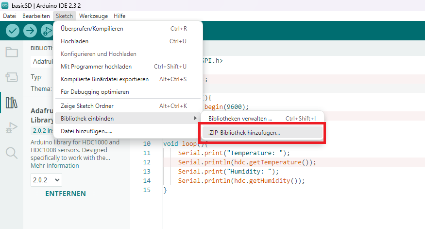 Öffne die Arduino IDE, gehe zum Menü Sketch > Bibliothek einbinden > .ZIP Bibliothek hinzufügen...