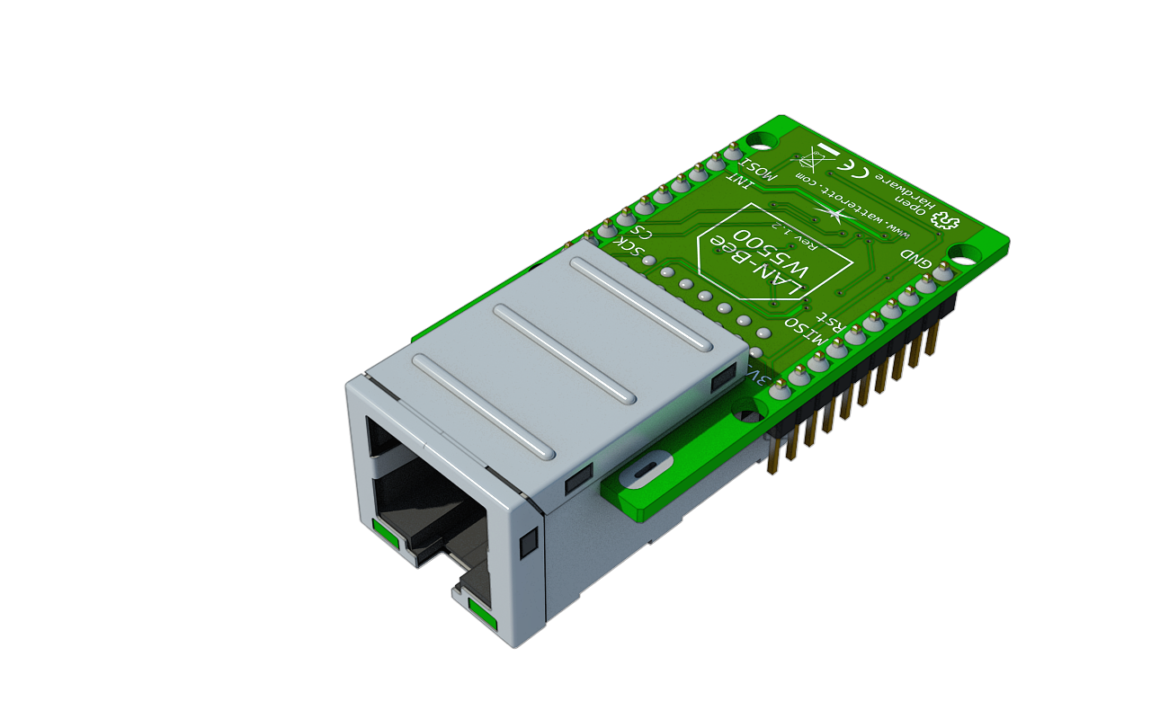 Das Ethernet-Bee ist ein Verbindungsstück, um die senseBox via Kabel mit dem Internet zu verbinden. Das LAN-Bee basiert auf dem W5500 Mikrochip von Wiznet, welcher eine hohe Datenübertragungsrate ermöglicht.