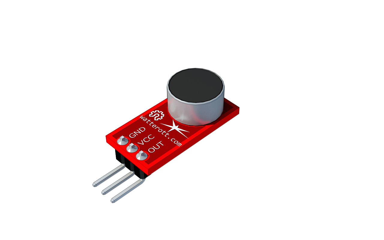 This condenser microphone from Watterott Electronics is equipped with an amplifier and can detect noises between 58 and 110 dB. It outputs the measured noises in a range of 0-5V.