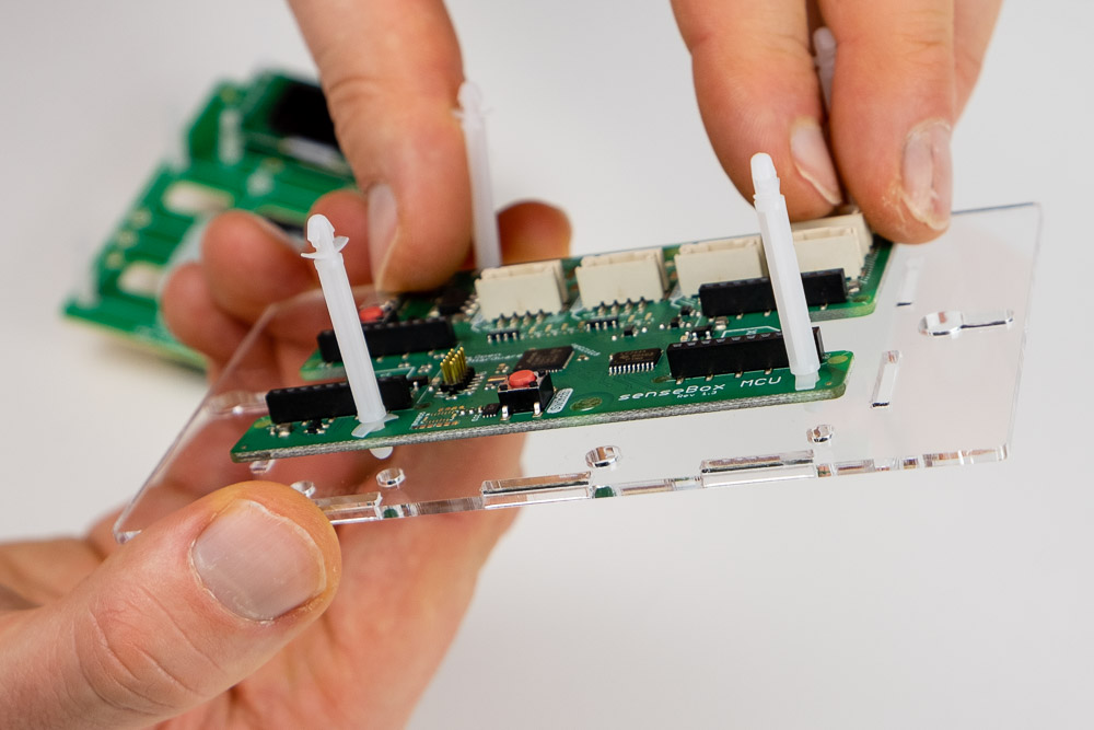 Insert the four long spacers into the corner holes of the senseBox MCU: