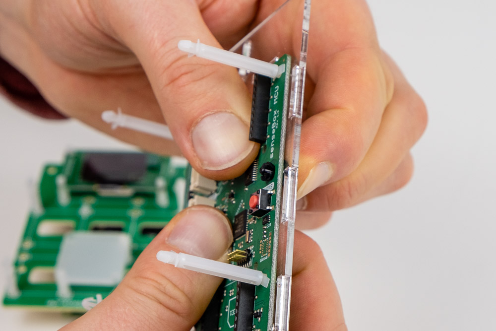 Use the black plastic clips to secure it. Insert them from below through the plexiglass plate and then through the board. Press them firmly until they snap into place: